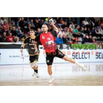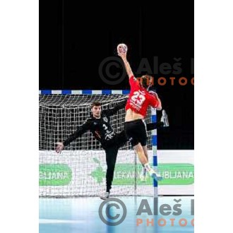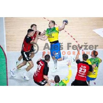 Aleks Vlah in action during 1.NLB league handball match between Gorenje Velenje and Celje Pivovarna Lasko in Velenje, Slovenia on September 25, 2022