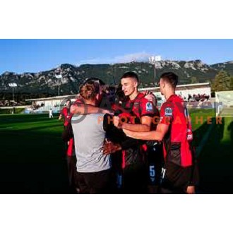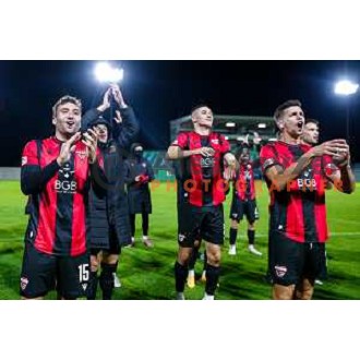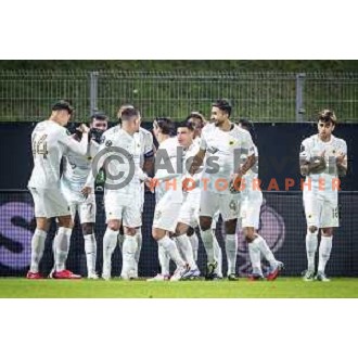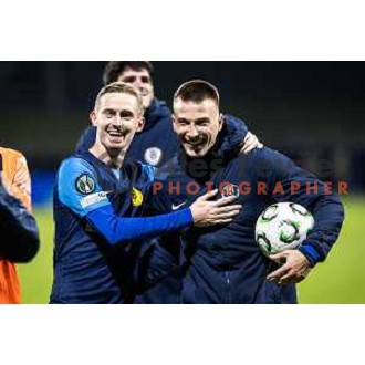 Coach Ziga Janskovec, Blaz Kavcic, Luka Gregorc, Grega Zemlja, Captain Blaz Trupej and players and staff of Slovenia celebrate victory 3:2 in Davis Cup match Slovenia- Finland, played in Hala Tivoli, Ljubljana, Slovenia on March 6, 2011