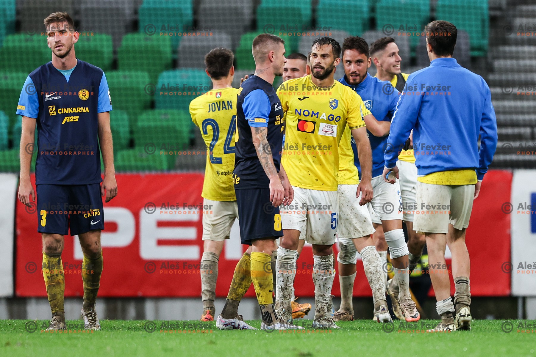 Nemanja Jaksic, Matej Poplatnik and Milan Tucic celebrate victory at Prva liga Telemach 2024/2025 football match between Bravo and Celje in Ljubljana on September 28,2024