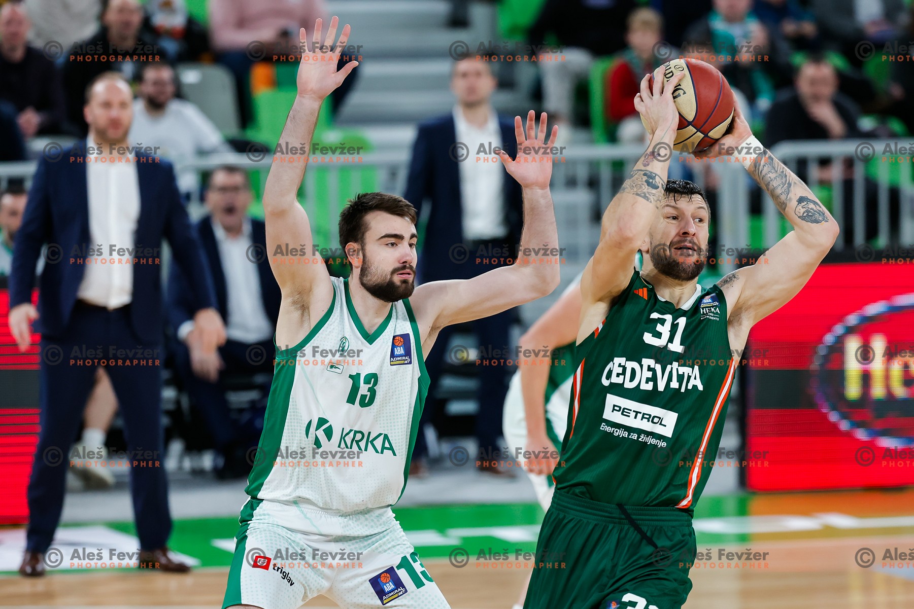 Robert Jurkovic of Krka and Andrija Stipanovic during ABA League 2024/2025 basketball match between Cedevita Olimpija and Krka in Ljubljana, Slovenia on January 5, 2025