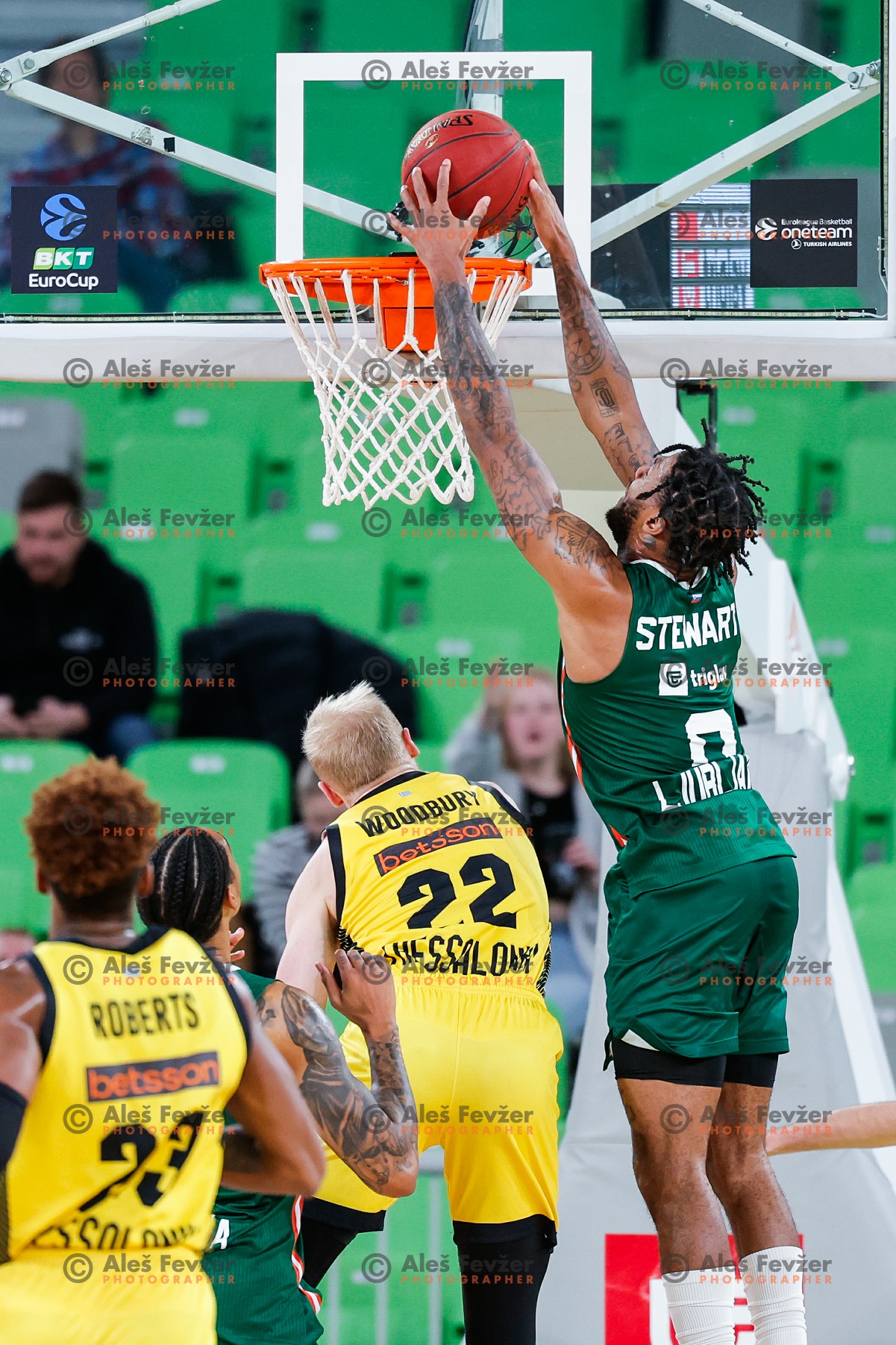 DJ Stewart in action during BKT EuroCup 2024/2025 regular season basketball match between Cedevita Olimpija and Aris Thessaloniki in SRC Stozice, Ljubljana, Slovenia on January 8, 2025