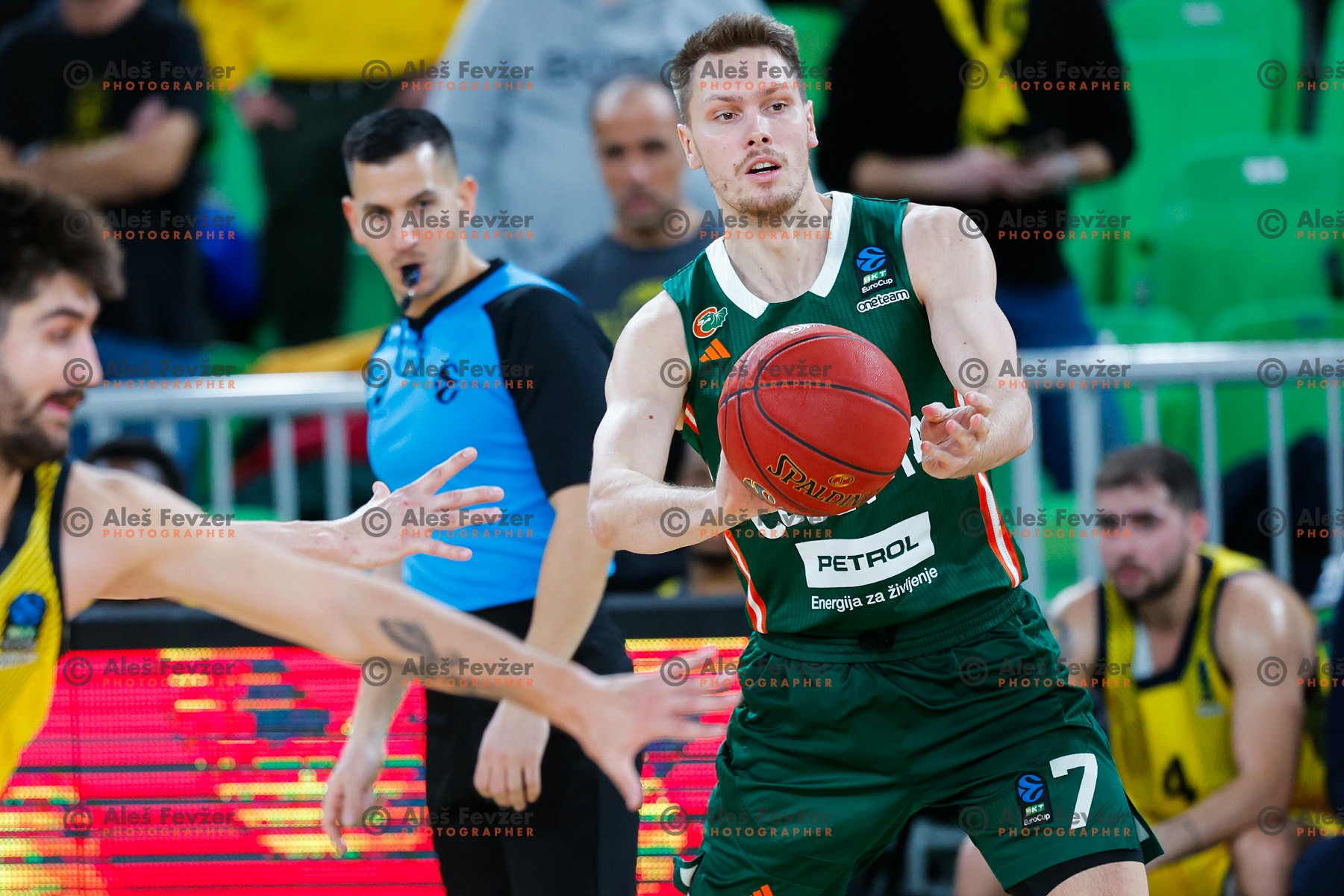 Gregor Glas in action during BKT EuroCup 2024/2025 regular season basketball match between Cedevita Olimpija and Aris Thessaloniki in SRC Stozice, Ljubljana, Slovenia on January 8, 2025