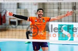 in action during the third match of the Final of 1.DOL Sportklub Volleyball League between ACH Volley and Alpacem Kanal in Tivoli Hall, Ljubljana, Slovenia on April 22, 2025