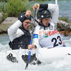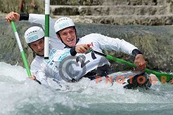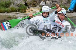 Luka Bozic and Saso Taljat of Slovenia in action during kayak & canoe ICF International slalom "Tacen 2013" in Ljubljana, Slovenia on May 26, 2013