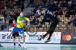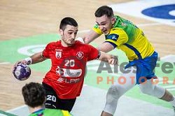 Jesus Hurtado Vergara vs Alexander Peric in action during 1.NLB League handball match between RK Celje PL and LL Grosist Slovan in Dvorana Zlatorog, Celje, Slovenia on February 22, 2025. Photo: Jure Banfi