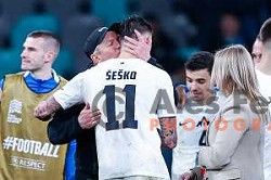Matjaz Kek and Benjamin Sesko of Slovenia celebrate victory at UEFA Nations League 2025 play-off match between Slovenia and Slovakia in Arena Stozice, Ljubljana, Slovenia on March 23, 2025