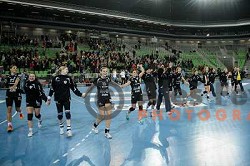 Krim players celebrate victory during handball match Krim Mercator - Podravka in EHF Women's Champion league, played in Arena Stozice, Ljubljana, Slovenia on November 18, 2012