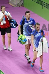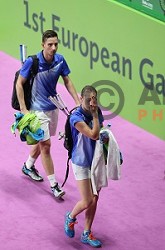 Primoz Flis and Kaja Stankovic of Slovenia play in group stage of Badminton Tournament at First European Games Baku 2015 in Baku Sports Hall, Azerbaijan on June 22, 2015