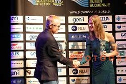 Coach Milan Kranjc and Tina Sutej with Slovenian Athlete of the year 2023 award, Sentjernej, Slovenia on November 24, 2023