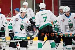 Ziga Urukalo and Nik Grahut, Robert Kristan of SZ Olimpija during Alps League ice-hockey match between SIJ Acroni Jesenice and SZ Olimpija in Podmezakla Hall, Jesenice, Slovenia on December 30, 2017