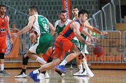 in action during Final of Alpe Adria Sixt Cup basketball match between Helios Suns (SLO) and MBL Rieker Com Komarno (SVK) in Domzale, Slovenia on April 24, 2017