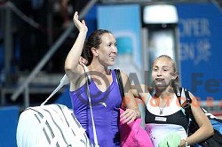 Jelena Jankovic and Aleksandra Krunic of Serbia celebrate victory in second round of the doubles at WTA Banka Koper Slovenia Open tennis tournament, played in SRC Marina, Portoroz, Slovenia on July 21, 2010