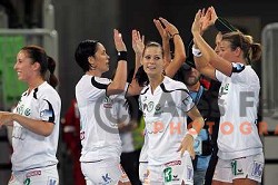 Anita Gorbicz and Gyori players celebrate victory at handball match Krim Mercator- Gyori Audi Eto KC in round 3 of Championsleague, played at Arena Stozice, Ljubljana, Slovenia on October 23, 2010