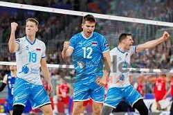 Rok Mozic of Slovenia in action during Men’s Volleyball Nations League match between Slovenia and Canada in Ljubljana, Slovenia on July 17, 2025. Photo Grega Valancic