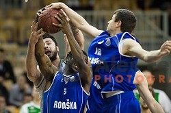 Nikola Jankovic, Taylor Johns in action during Nova KBM League Basketball match between Olimpija and Rogaska in Ljubljana, Slovenia on April 19, 2017