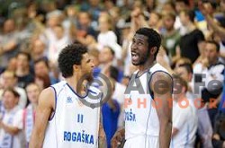 Jaka Blazic and Gasper Vidmar of Slovenia in action during Telemach basketball match between Slovenia and Croatia in Stozice Arena, Ljubljana on August 24, 2017