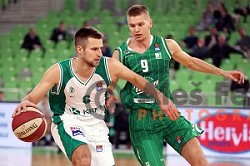 Matej Rojc and Blaz Mesicek in action during ABA league basketball match between Union Olimpija and Krka in Stozice Hall, Ljubljana, Slovenia on December 5, 2016