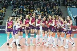 Nina Stojiljkovic, Nika Dobaj, Ela Pintar, Tessa Grubbs, Anamarija Galic, Klara Milosic, Ana Mojca Kranjc and other players of Nova KBM Branik prior to CEV Champions League women volleyball match between Nova KBM Branik and VC Lokomotiv Kaliningrad in Lukna, Maribor, Slovenia on February 4, 2020