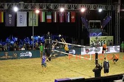 Vid Jakopin in action during semi-final of Beach Volleyball World Tour tournament in Ljubljana, Slovenia on August 2, 2020