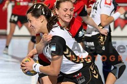 Bodnieva, Vergelyuk in action during handball match Krim Eta Malizia- Slagelse FH in Final of EHF Championsleague, played at Kodeljevo Hall, Ljubljana, Slovenia 22.5.2004. Slagelse FH won 36-32 and became a Champion