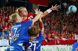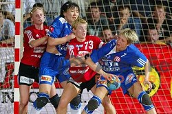 Anja Andersen, Marjan Doler, Robert Begus in action during handball match Krim Eta Malizia- Slagelse FH in Final of EHF Championsleague, played at Kodeljevo Hall, Ljubljana, Slovenia 22.5.2004. Slagelse FH won 36-32 and became a Champion