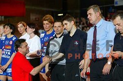 Zoran Jankovic,Tomanovic, Tiselj, Begus, Marjan Doler after handball match Krim Eta Malizia- Slagelse FH in Final of EHF Championsleague, played at Kodeljevo Hall, Ljubljana, Slovenia 22.5.2004. Slagelse FH won 36-32 and became a Champion