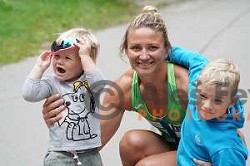 Spela Ponomarenko Janic with her's children during kayak K-1 practice session on lake Bohinj, Slovenia on July 31, 2020