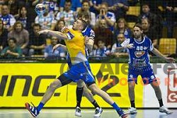 Vid Levc and David Miklavcic during Slovenian Supercup handball match between Gorenje Velenje and Celje Pivovarna Lasko in Slovenj Gradec, Slovenia on August 30, 2019