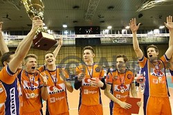 Players of ACH volley celebrate victory at Mevza Cup Final between ACH Volley Ljubljana (Slovenia) and Hypo Tirol Innsbruck (Austria) in Tivoli Hall, Ljubljana on March 12, 2016