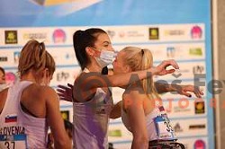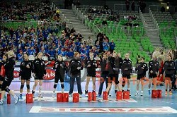 Krim Mercator players in action during handball match Krim Mercator - Oltchim Valcea in EHF Women's Champion league, played in Arena Stozice, Ljubljana, Slovenia on February 10, 2013