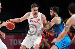 Pau Gasol and Mike Tobey in action during men’s group C preliminary round basketball match between Slovenia and Spain in Saitama Super Arena at Tokyo 2020 Summer Olympic Games, Japan on August 1, 2021