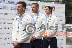 Benjamin Savsek (SLO), Luka Bozic (SLO) and Anze Bercic (SLO) celebrating during European Senior Canoe Team slalom Championships in Tacen, Ljubljana, on June 2nd, 2017