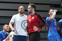 Urban Lesjak in action during preparation handball match for Paris 2024 Summer Olympic Games between Slovenia and Egypt in Arena Zlatorog, Celje on July 8, 2024