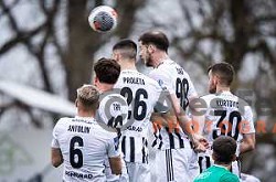 Danijel Sturm and players of Domzale celebrate goal at Prva liga Telemach 2024/2025 football match between Celje and Domzale in Celje, Slovenia on December 7, 2024