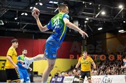 Tim Cokan in action during 1.NLB league handball match between Gorenje Velenje and Celje Pivovarna Lasko in Velenje, Slovenia on March 10, 2024