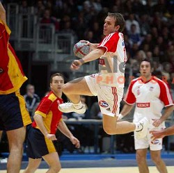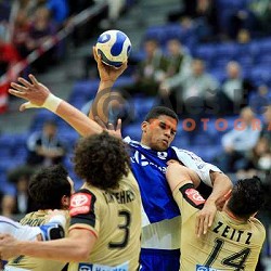 Norway, Lillehammer, 27/01/2008. Daniel NARCISSE (8) vs. Frank von BEHREN (3) and Christian ZEITZ (14) during the European Handball Championship 3/4 place ranking match Germany - France.