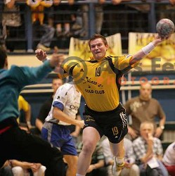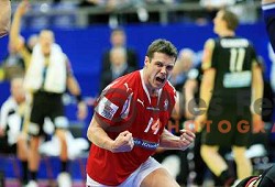 Norway, Lillehammer, 26/01/2008. Michael V. KNUDSEN (14) cheering after getting seven decisive seven meters shot at the final seconds of European Handball Championship semifinal match Denmark - Germany.