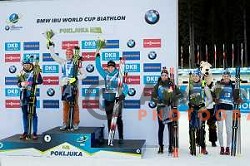 Hanna Oeberg, Denise Herrmann, winner of Women Individual 15 km and Anais Bescond at IBU Biathlon World Cup at Pokljuka, Slovenia on January 24, 2020