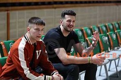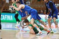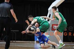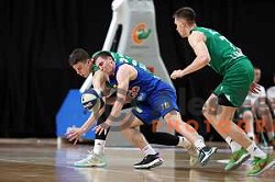 Matej Cibej and Luka Scuka in action during semi-final of Nova KBM League between Cedevita Olimpija and Sencur GGD in Ljubljana, Slovenia on May 19, 2024