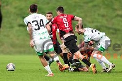 Danijel Sturm and Mark Spanring in action during Prva Liga Telemach 2024/25 football match between Bravo Kostel and Domzale in Ljubljana, Slovenia on September 15, 2024