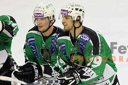 Ales Music, Ziga Pance of Tilia Olimpija celebrate victory during ice-hockey match Tilia Olimpija-Vienna Capitals in round 36 of EBEL league, played in Hala Tivoli, Ljubljana on January 7, 2011