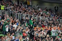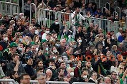 Fans of Cedevita Olimpija celebrate during 7days EuroCup regular season basketball match between Cedevita Olimpija and Buducnost Voli in Stozice, Arena, Ljubljana, Slovenia on March 8, 2022