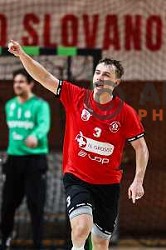 Stas Slatinek Jovicic in action during 1.NLB League handball match between LL Grosist Slovan and Gorenje Velenje in Ljubljana, Slovenia on November 30, 2024