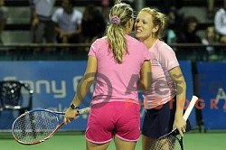 Winners of doubles Vladimira Uhlirova of Czech republic and Maria Kondratieva of Russia in action during final of WTA Banka Koper Slovenia Open tennis tournament, played in SRC Marina, Portoroz, Slovenia on July 24, 2010