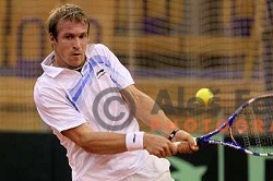 Grega Zemlja in action during singles match at day 1 of Davis Cup match Slovenia- Finnland , played in Hala Tivoli, Ljubljana, Slovenia on March 4, 2011