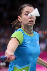 Maja Tvrdy of Slovenia in action in second round of badminton tournament in Wembley Arena at London 2012 Summer Olympic games on July 29, 2012