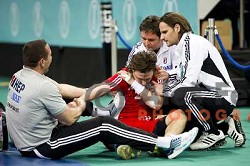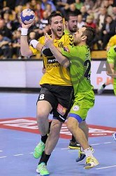 action during handball match Gorenje Velenje (SLO)-Hamburg (GER) in EHF Champions league, played in Red Hall, Velenje, Slovenia on February 5, 2014