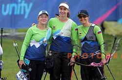 Zana Pintaric, Urska Cavic, Ana Umer of Slovenia Archery team during Women’s Recurve Team Quarterfinal at European Games in Krakow, Poland on June 24, 2023