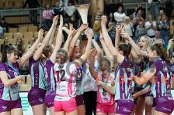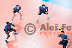 Players of Calcit Volley in action during the third match the Final of the Slovenian Championship between of ACH Volley and Calcit Volley in Tivoli Hall, Ljubljana, Slovenia on April 24, 2024. Grega Valancic/ alesfevzer.com