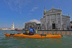 Exploring city of Venice with sea kayaks during 2007 Carnival on Saint Mark Square.